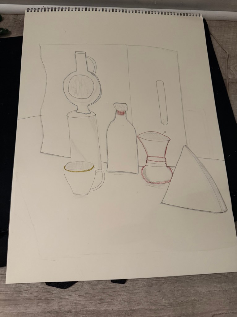 A still life study focused on ellipses and perspective. I used guide lines to build the forms and emphasized final outlines with darker pencil and color accents to show depth and proportion.