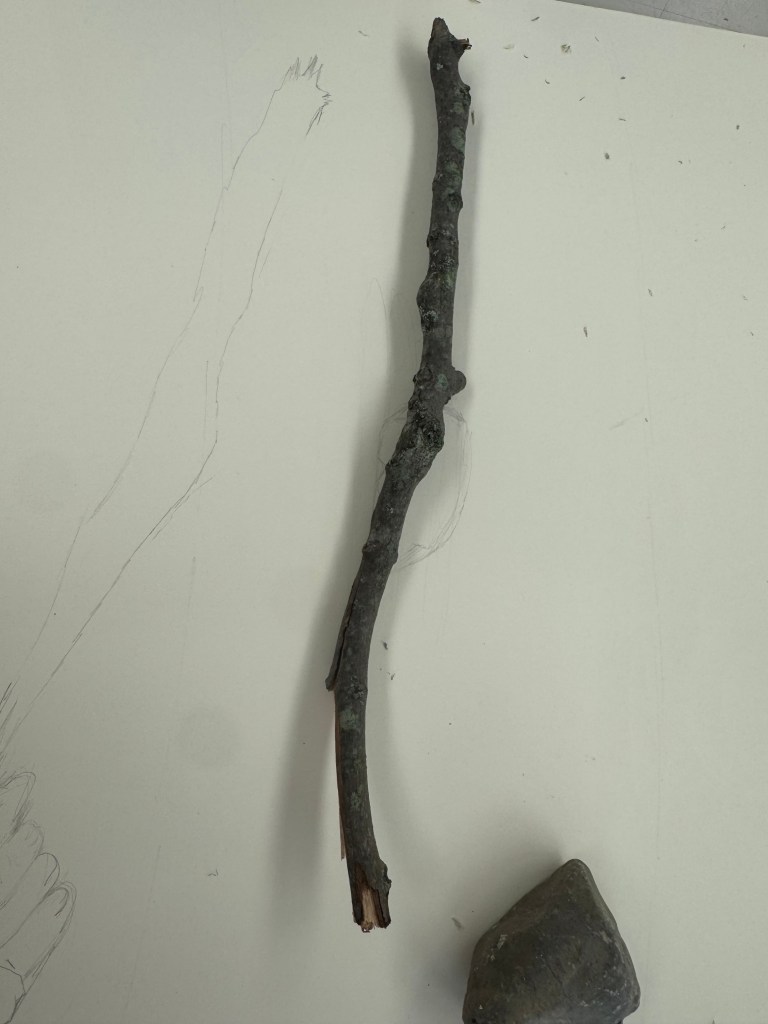 A still life study of simple natural objects: a stem, a branch, and a rock. I focused on clean outlines and careful observation to show their different textures and forms.