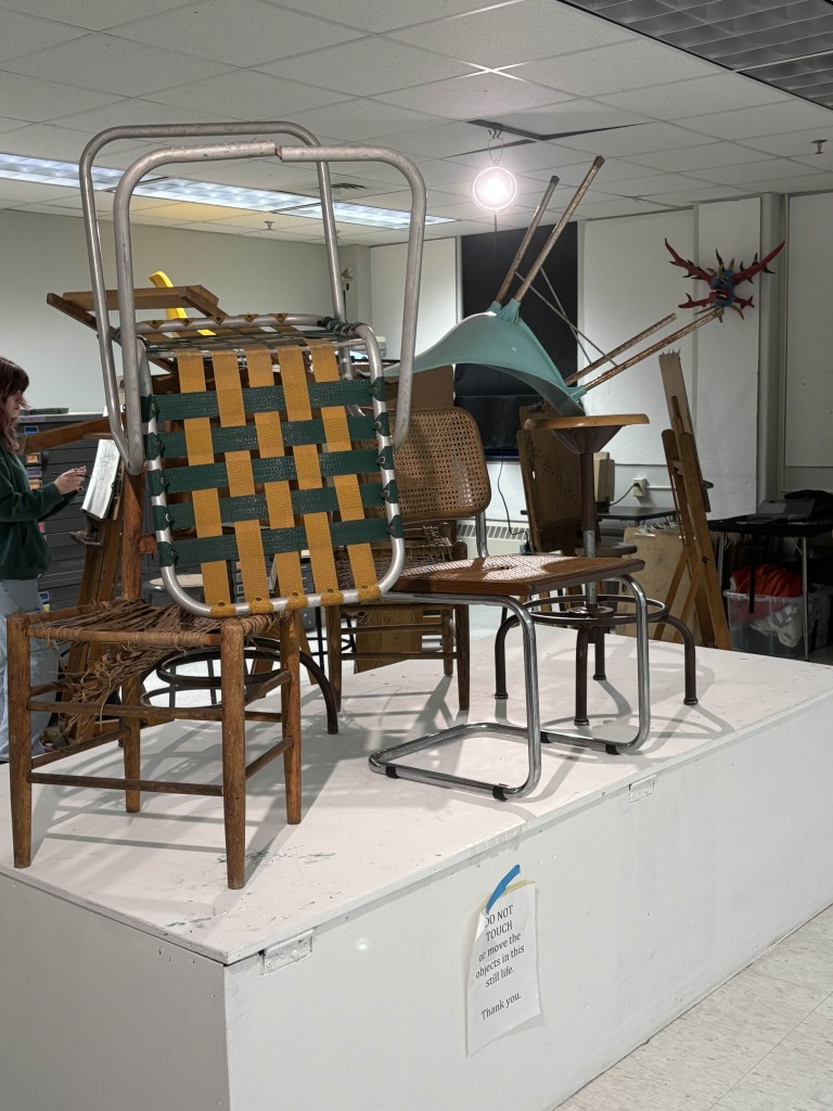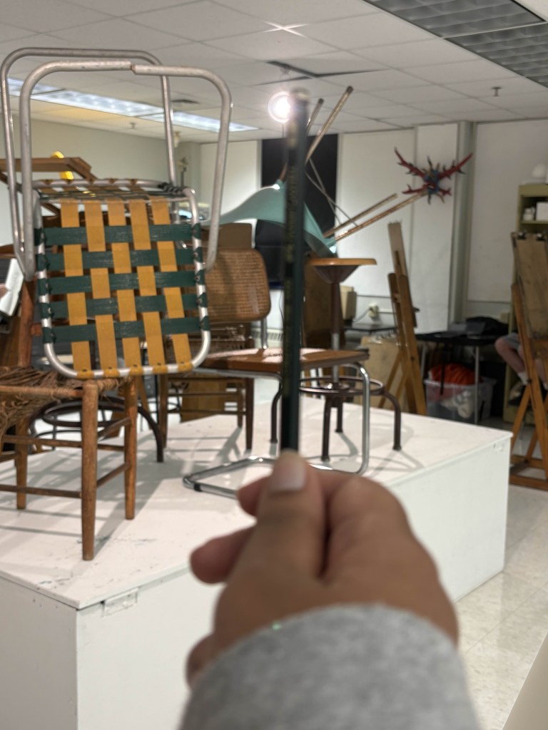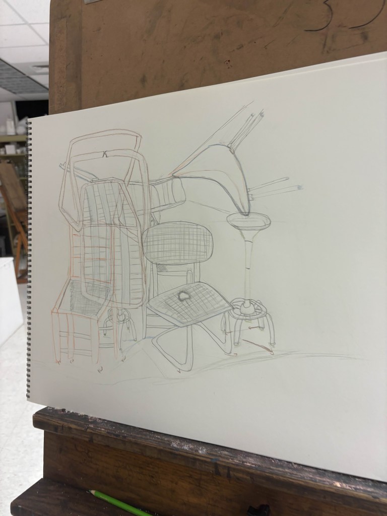 We are using organizational lines to map out and align complex objects in space before committing to detailed contours. We learned a key point in drawing compositions with space. We hold a pencil up to help measure relative heights, widths, and angles.